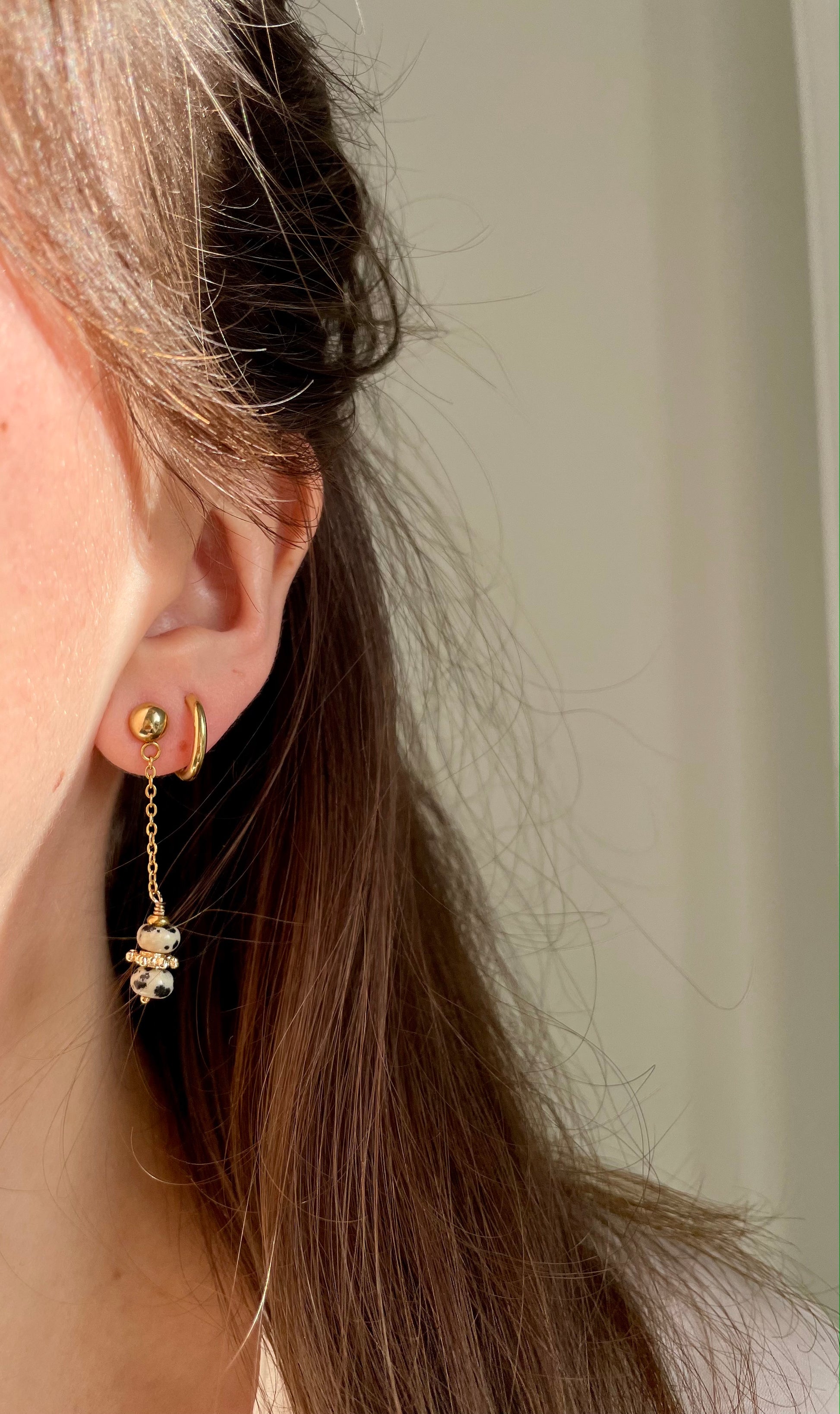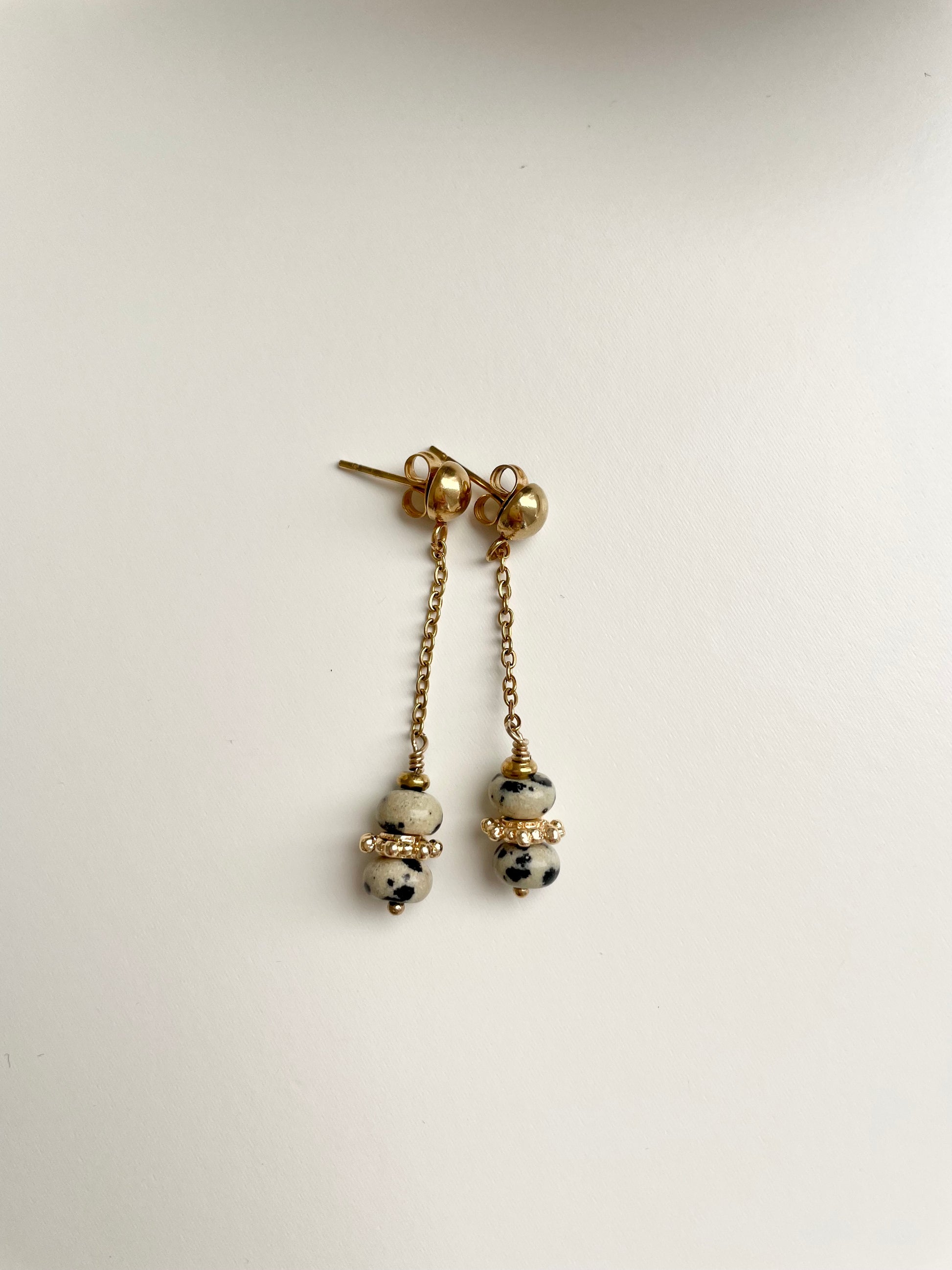 Boucles d’oreilles type pendantes ornées de perles en pierre de jaspe dalmatien