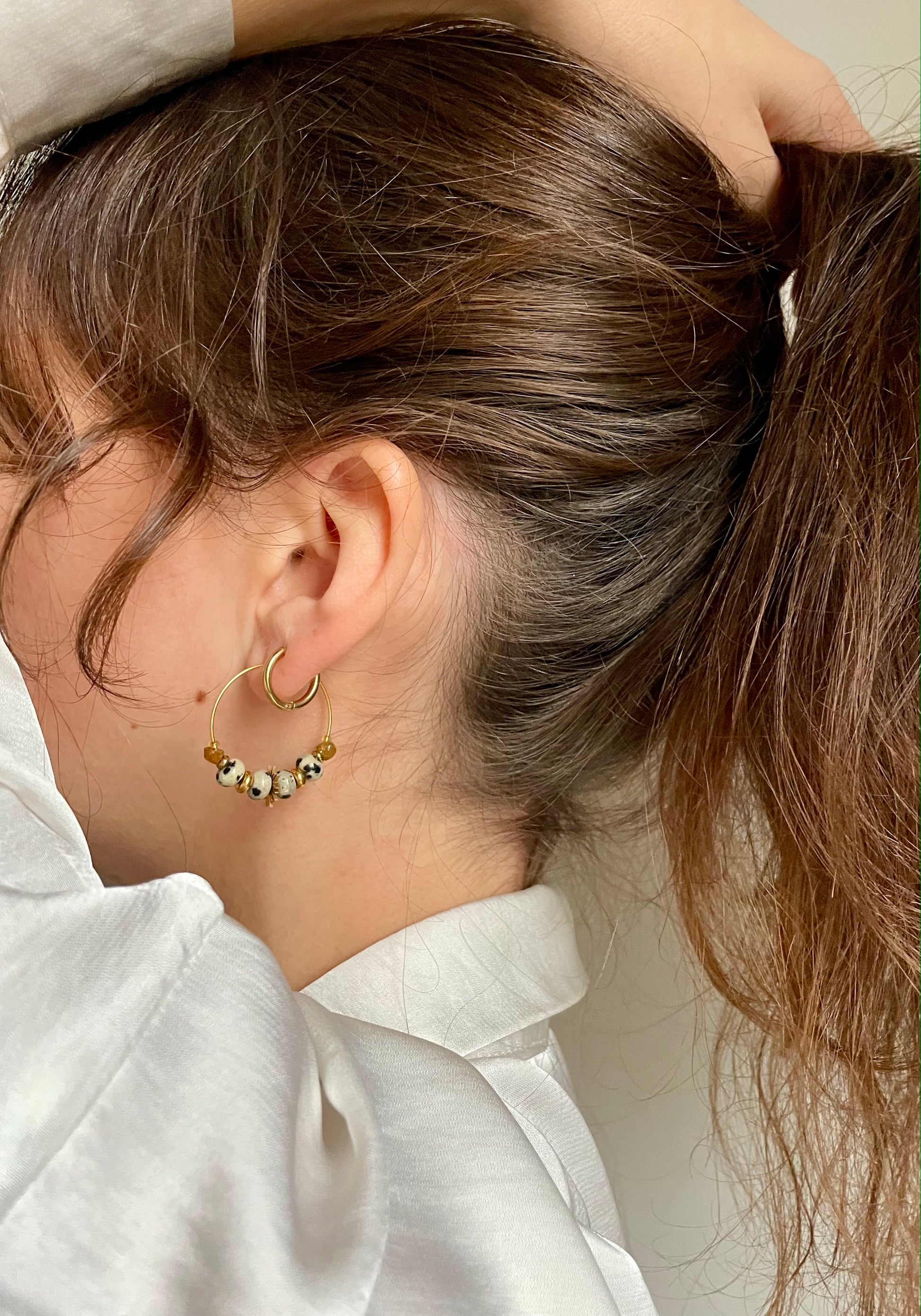 Les pierres présentes sur ces créoles sont des pierres naturelles, la couleur peut varier d’une boucle à l’autre.