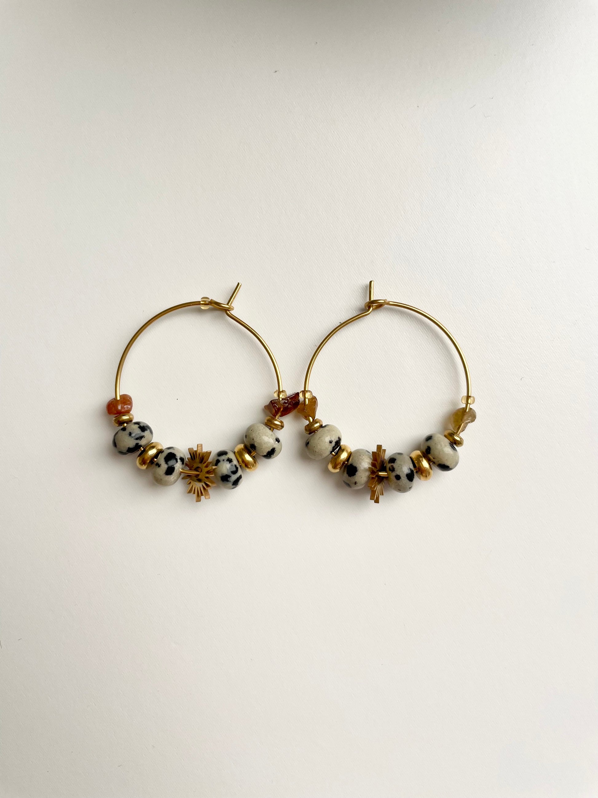 Les pierres présentent sur ces créoles sont des pierres naturelles, les couleurs et les formes peuvent varier d’une boucle à l’autre.