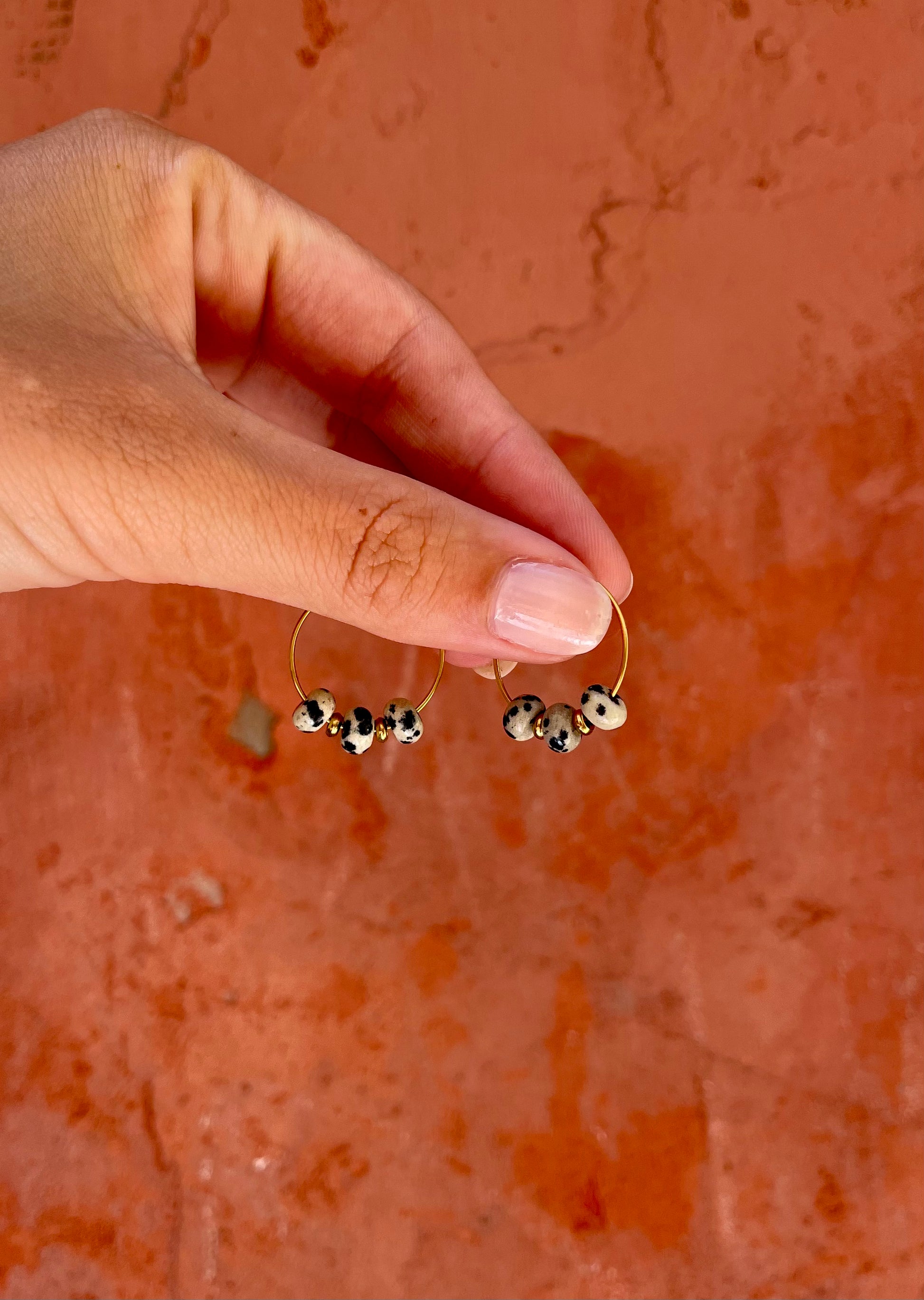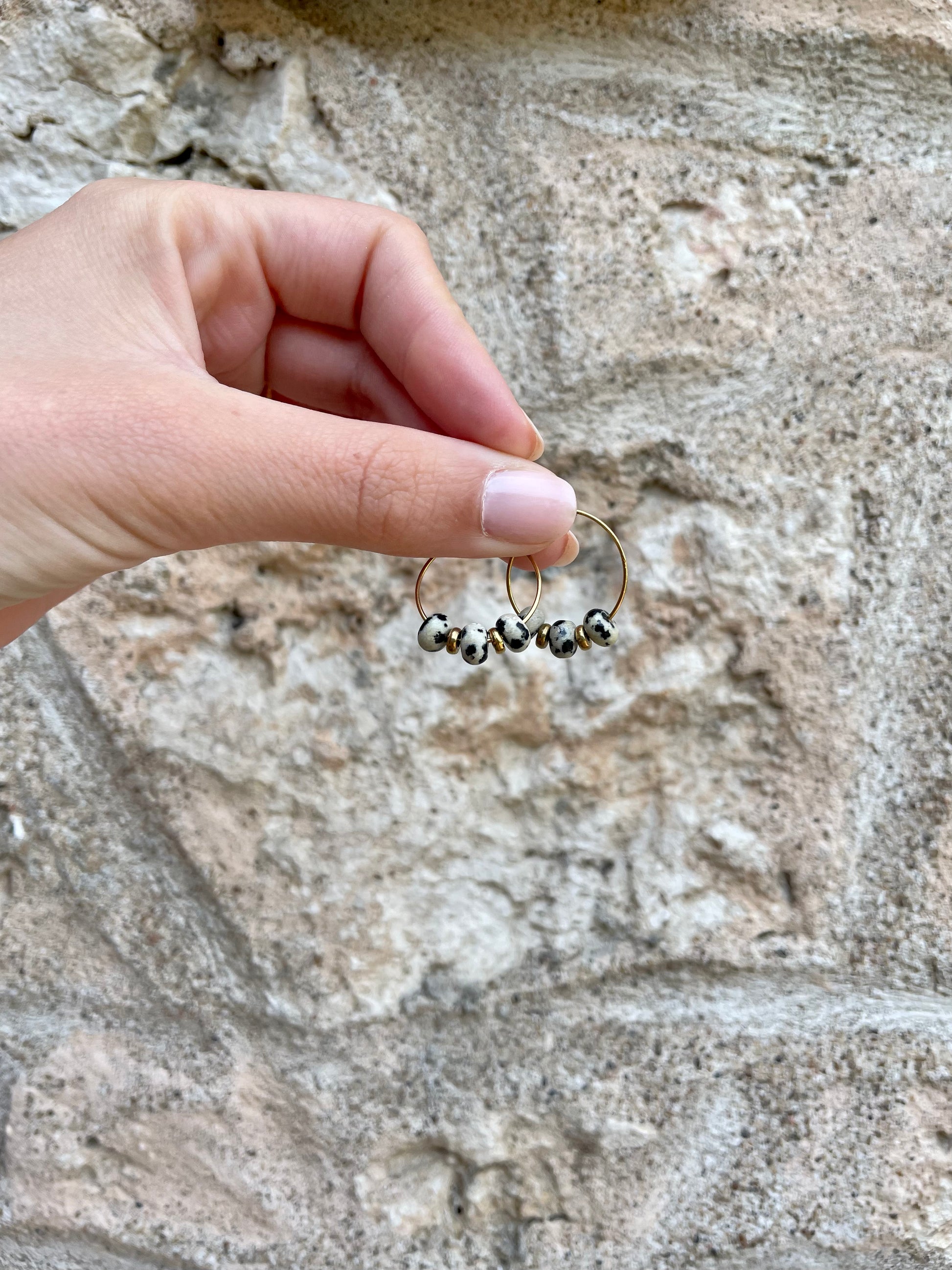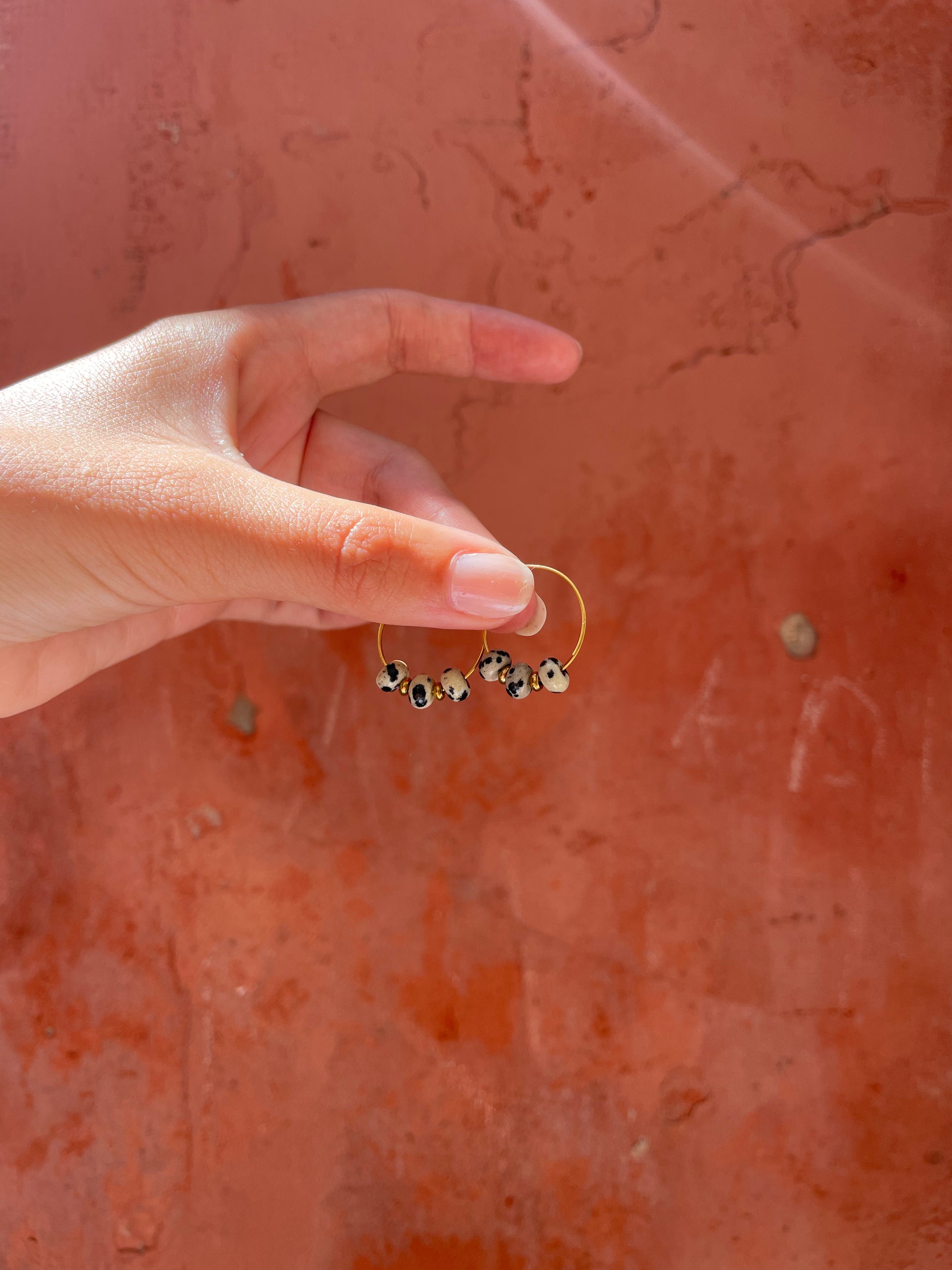 Boucles d’oreilles type créoles en acier inoxydable ornées de perles en jaspe dalmatien.