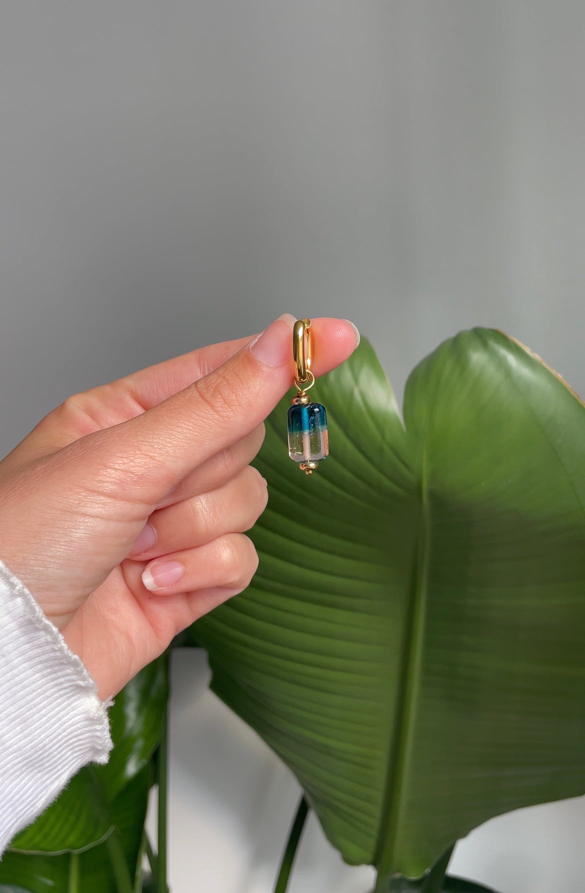 Boucles d’oreilles pendantes en acier inoxydable ornées de 2 perles en verre dégradée du transparent au bleu.