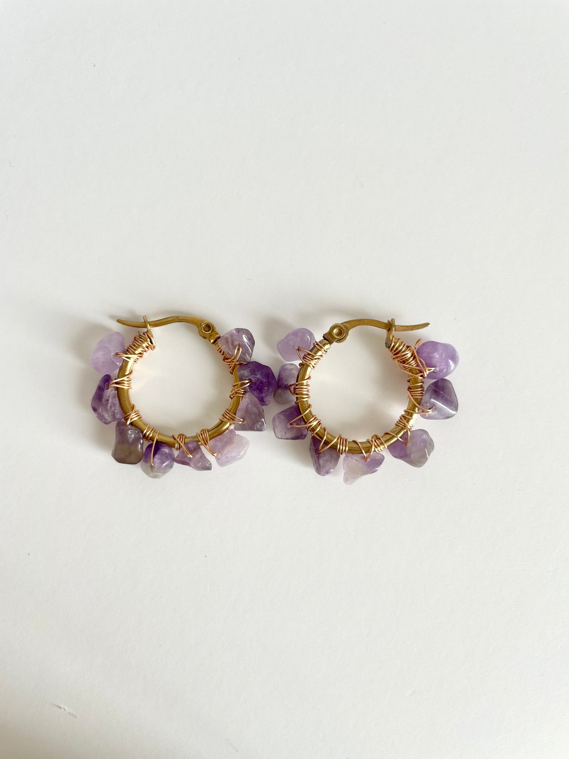 Boucles d’oreilles type créoles ornées de perles en pierre d'améthyste.