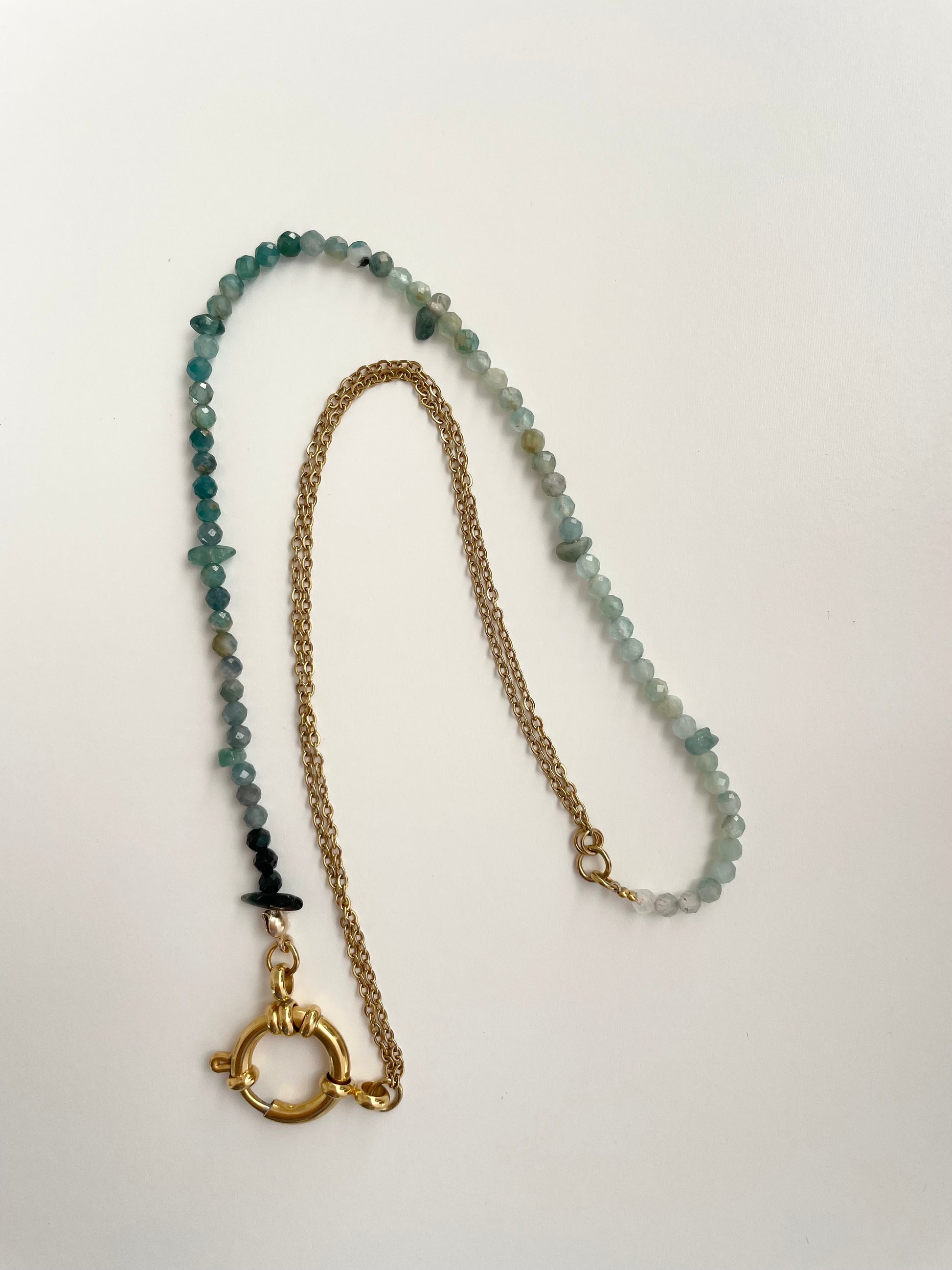 Collier composé de perles en pierre indicolite et tourmaline bleue, d'une chaine en acier inoxydable et d'un fermoir marin.
