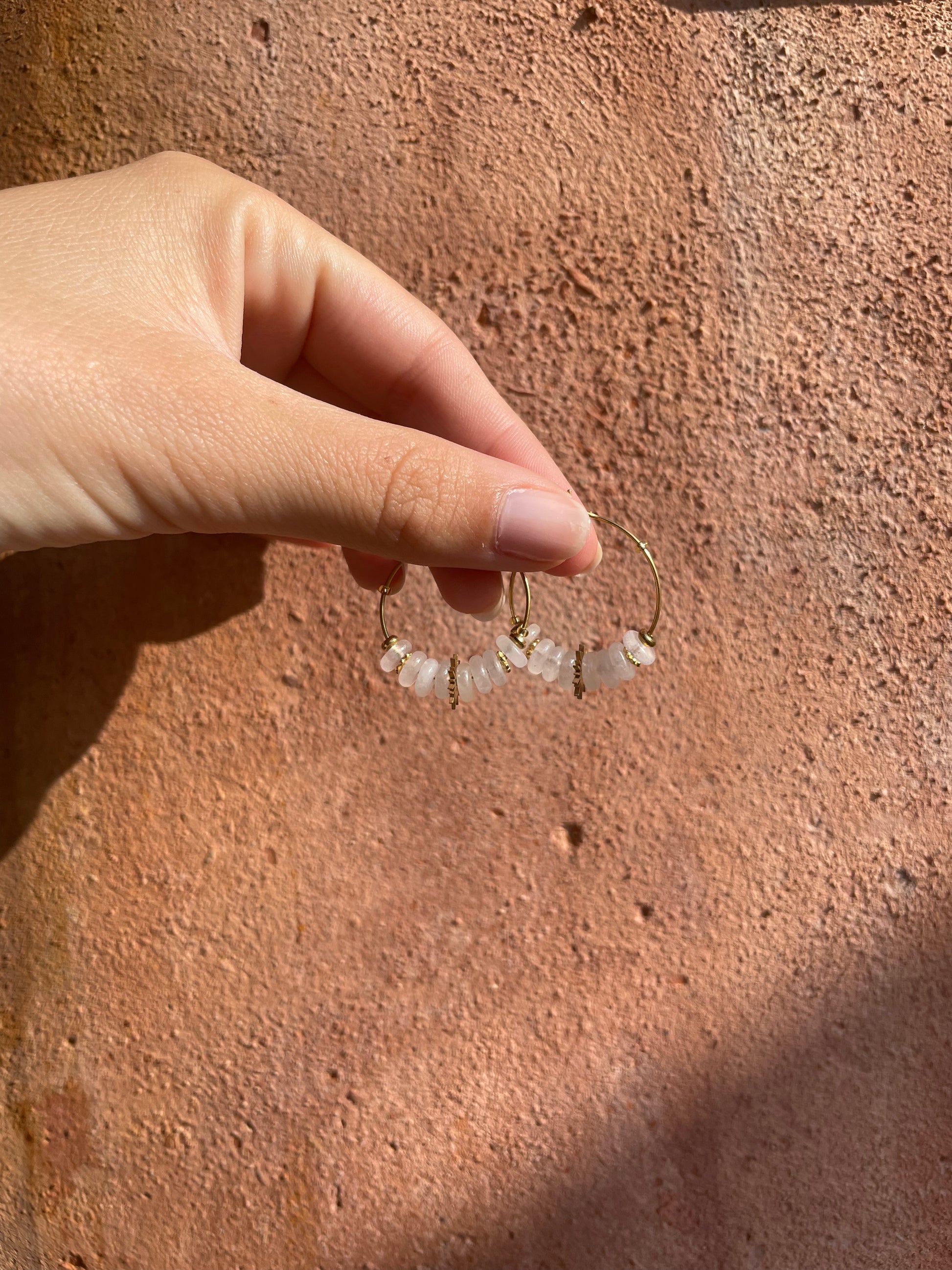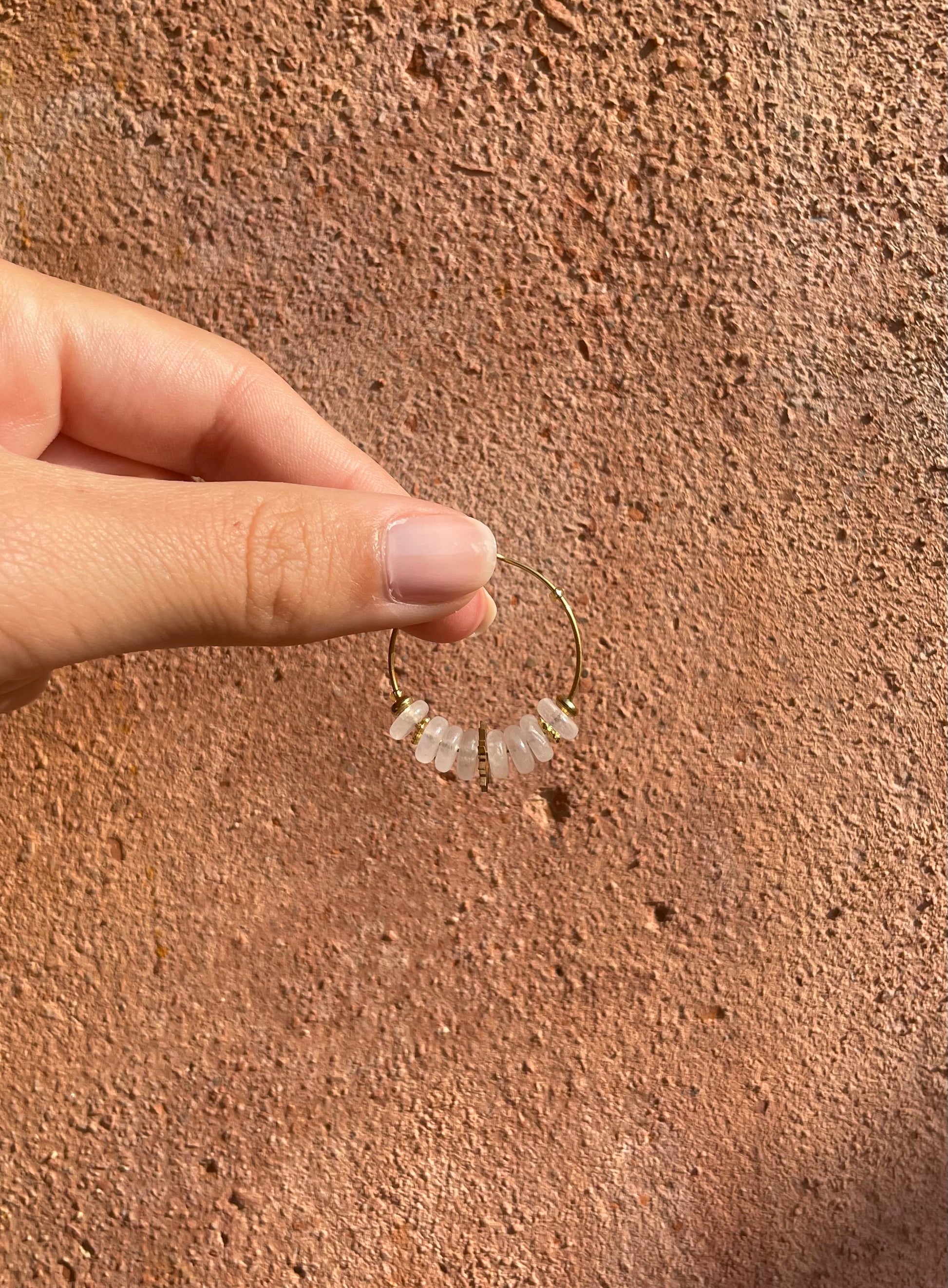 Boucles d’oreilles type créoles en acier inoxydable ornées de perles en quartz rose pale.