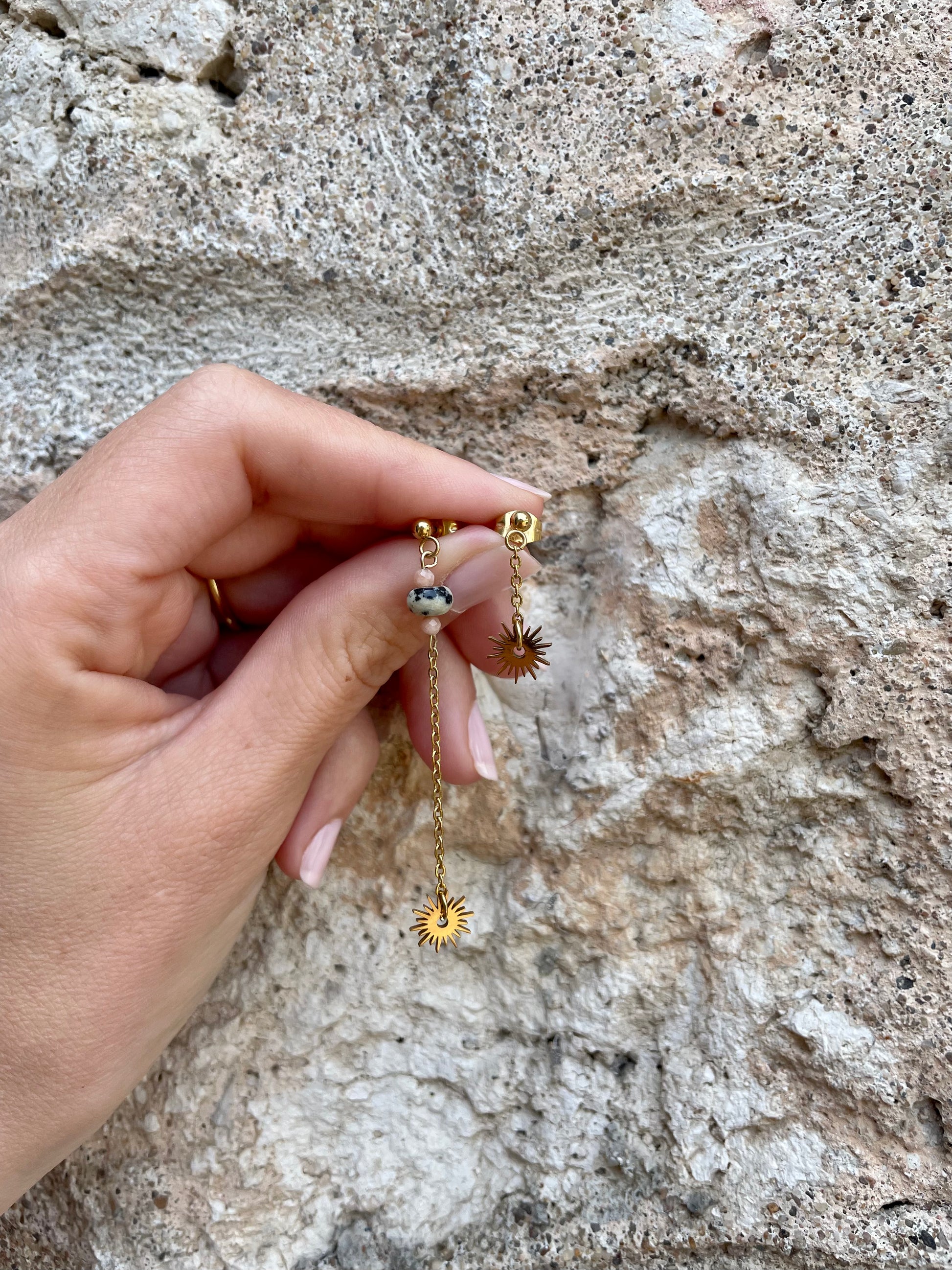Boucles d’oreilles type pendante en acier inoxydable ornées d’une perle en jaspe dalmatien et de perle en verre.